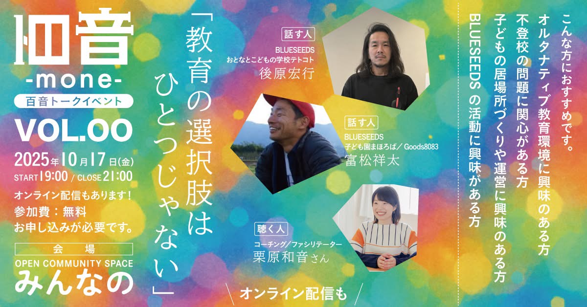 毎回オルタナティブスクールの運営者をお招きして、お話を聞く百音トークイベントが始まります。今回はVOL.00として、そもそも百音プロジェクトとは何かを、主催のBLUESEEDSよりご説明させていただく機会にさせていただきます。