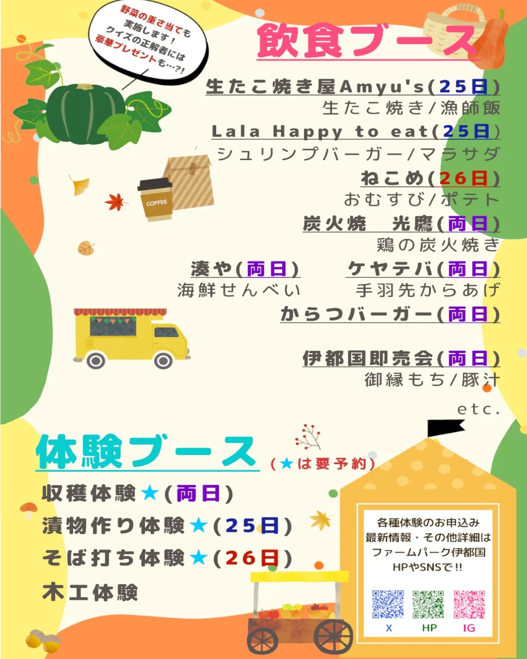 収穫体験やそば打ち体験、漬物作り体験などの体験ブース、ステージ、飲食ブースなど多彩な催しが楽しめます。