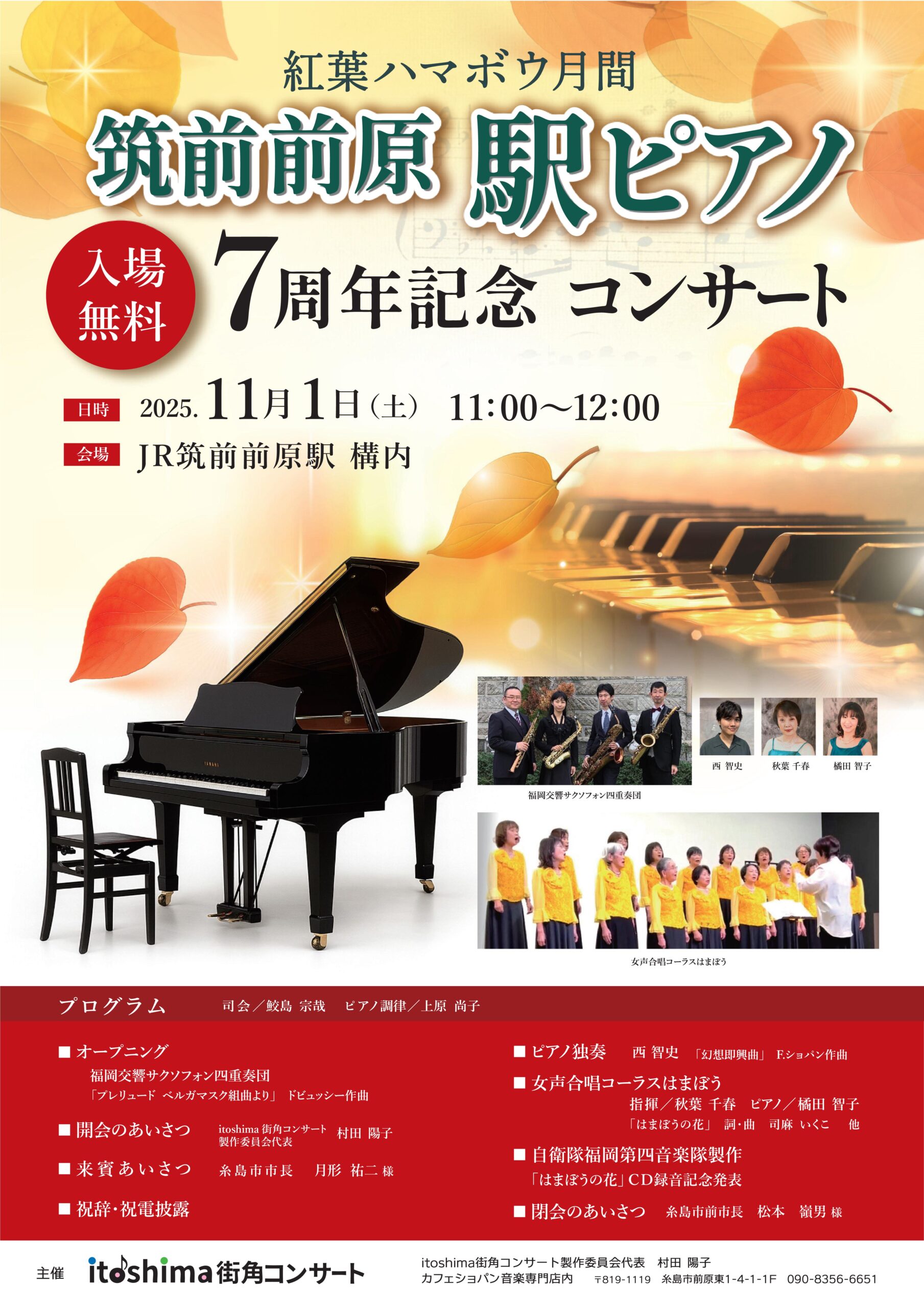 糸島市のJR筑前前原駅構内に設置された「駅ピアノ」の7周年を記念して、特別コンサートが開催されます。