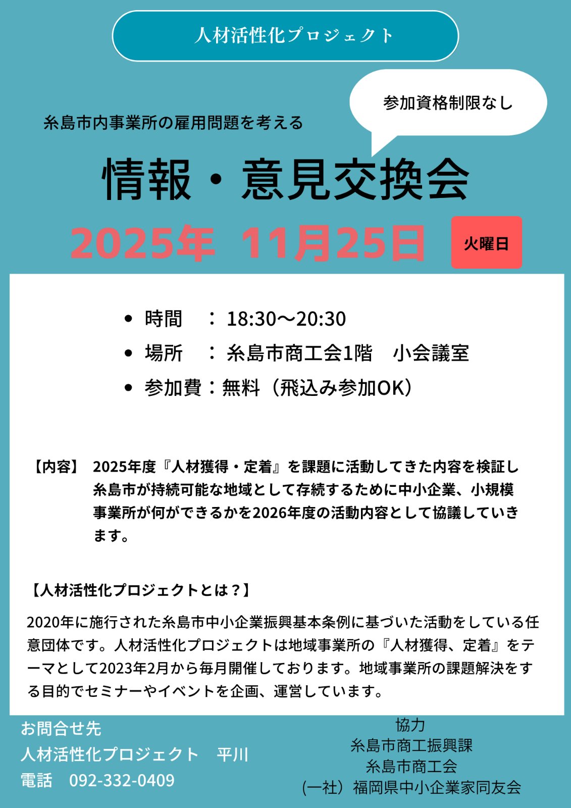 2025年度「人材獲得・定着」を過大に活動してきた内容を検証し、糸島市が持続可能な地域として存続するために中小企業、小規模事業所が何ができるかを2026年度の活用内容として協議していきます。
