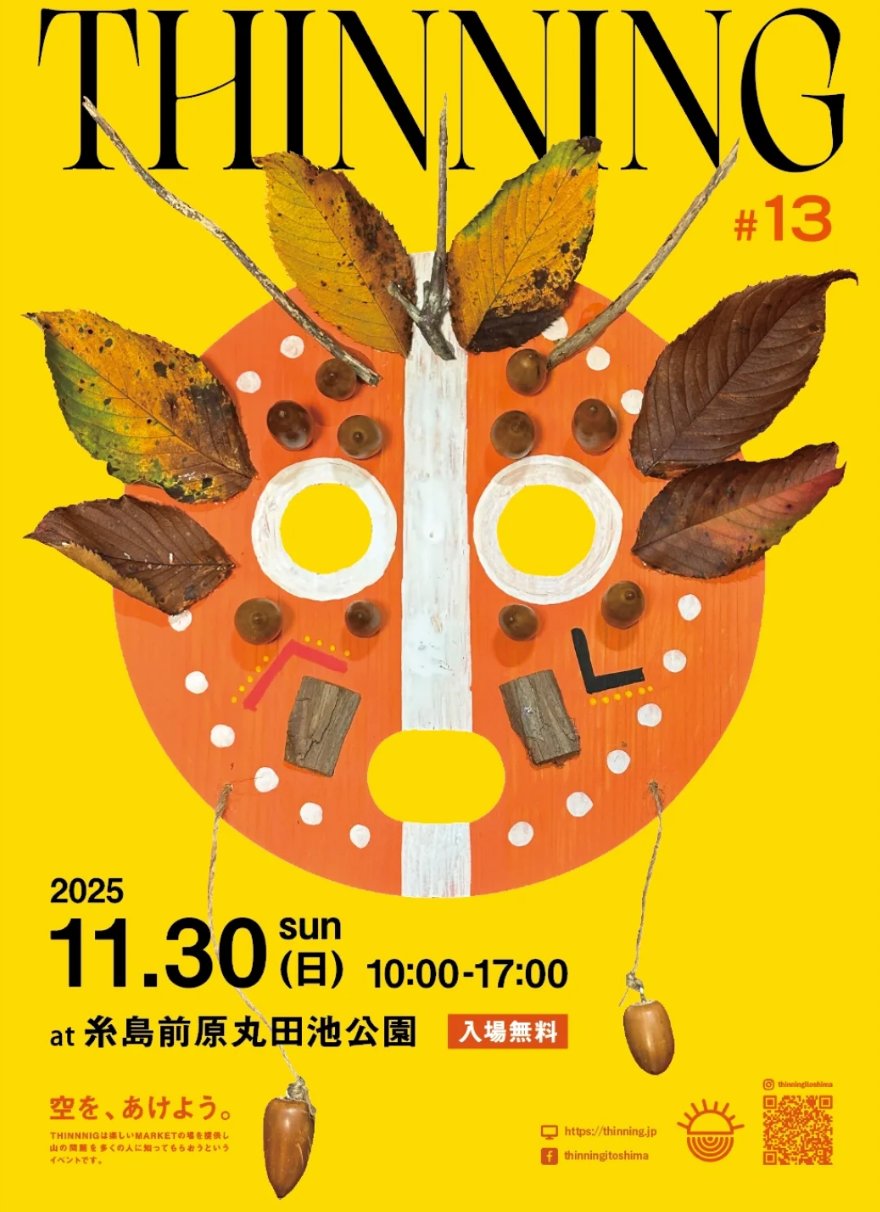 THINNINGは、楽しいMARKETの場を提供し、山の問題や海の問題を知っていただこうという目的をもったイベントです。会場には、なぜ間伐が必要なのかをわかりやすくしたポスターを掲示したり、福岡県が作った資料などを配布しています。13:00からのトークショーでは日本や糸島の山の現状を話したり、ゲストをお招きしてお話を聞いたりしています。今回のゲストは出店もしてくださる、糸島でフリースクールを運営されているNPO法人産の森学舎代表の大松 康さん。産の森が大切にしてることや、日々どんな活動をしているかなど、いろいろ聞いてみたいと思います。
