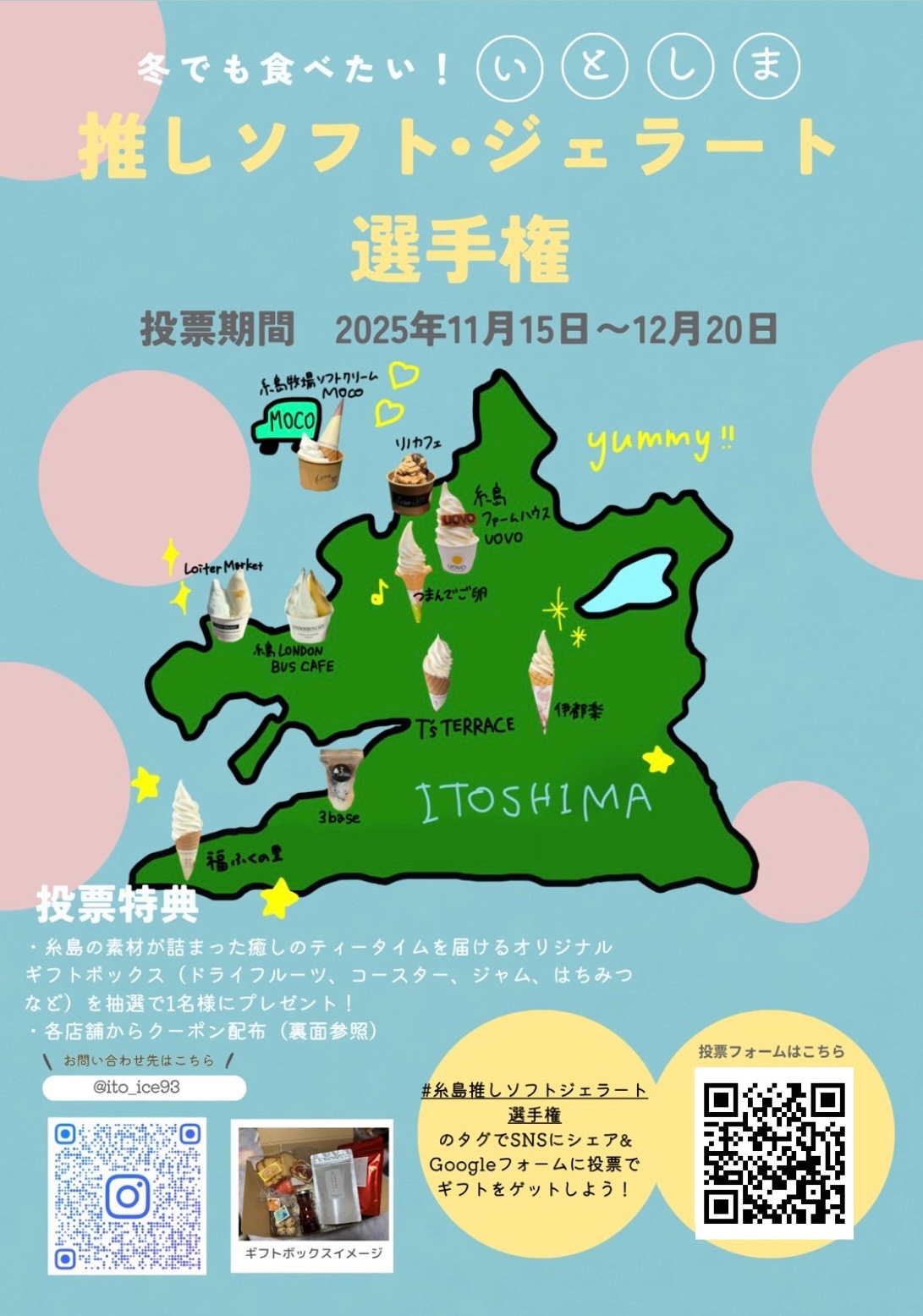 参加方法は、①対象店舗でソフトまたはジェラートを購入、②「#糸島推しソフトジェラート選手権」を付けてSNSに投稿、③チラシのQRコードから投票フォームに回答。SNS投稿とフォーム回答の両方で、糸島素材のギフトボックスが1名に当たります。