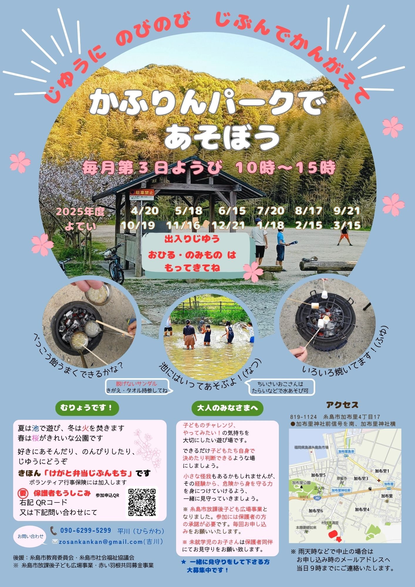糸島市加布里加布里神社横のかふりんパークにて、毎月第3日曜日プレイパークを開催しています。