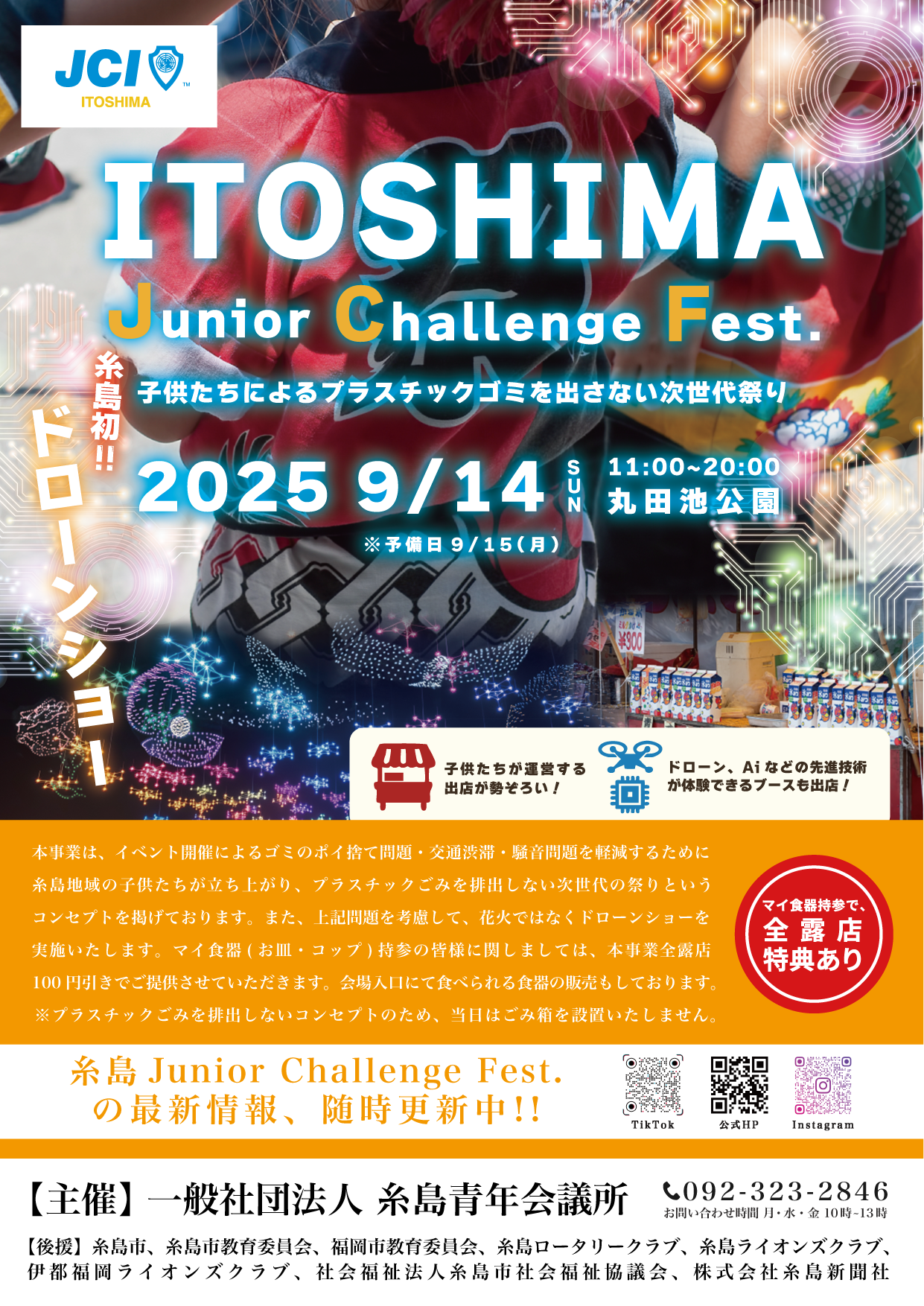 糸島の未来を担う子どもたちを中心に「挑戦」をテーマとした体験型イベントです。会場の丸田池公園では、ドローン体験、生成AIのワークショップ、地元企業によるブース展示、ステージ発表など多彩なプログラムが行われます。プラスチックごみゼロを目指すエコ活動も取り入れられており、地域ぐるみで子どもたちの学びと挑戦を応援します。親子で楽しみながら、環境・科学・地域文化を体験できるフェスティバルです。