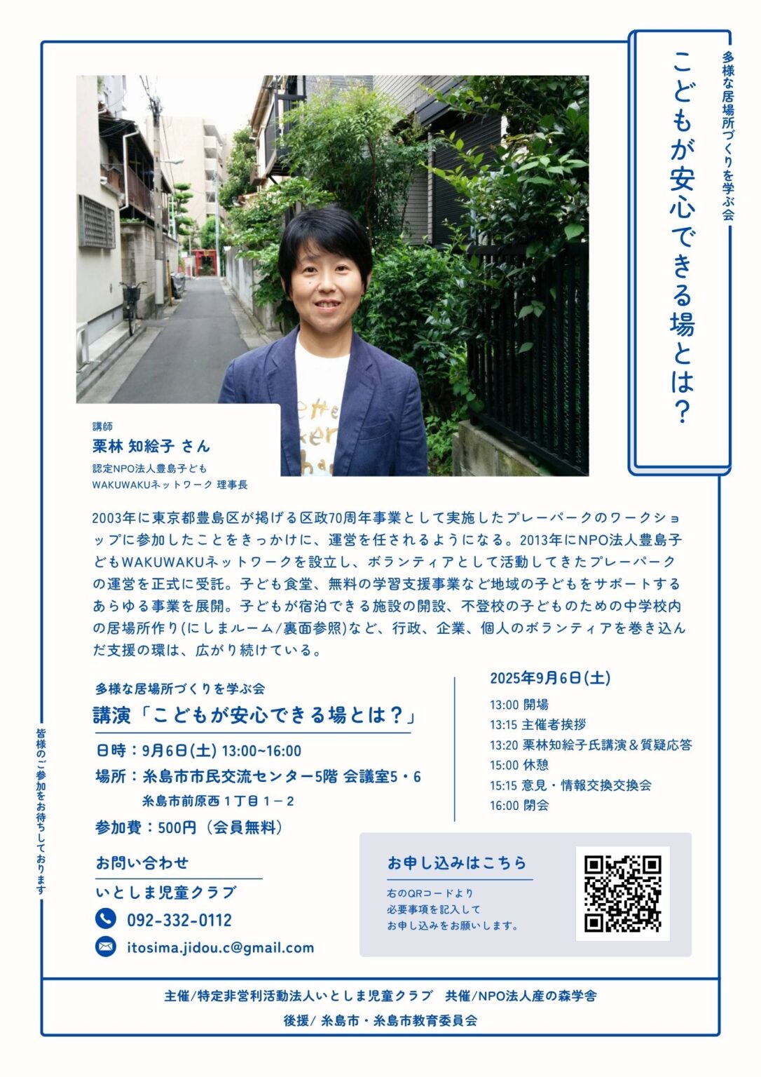 東京都豊島区でプレーパーク、子ども食堂、無料の学習支援事業など、地域のこどもを見守り育てるあらゆる事業を全国に先駆けてボランティアで展開し、最近は子どもが宿泊できる施設の開設、公立中学校内での居場所づくりなど、行政・企業などとも連携した支援の輪を広げ、子どもと家庭を伴走的に支援している 認定NPO法人豊島子どもWAKUWAKUネットワークの理事長である栗林知絵子さんをお招きして、こどもが安心して過ごせる場づくりについて学びます。