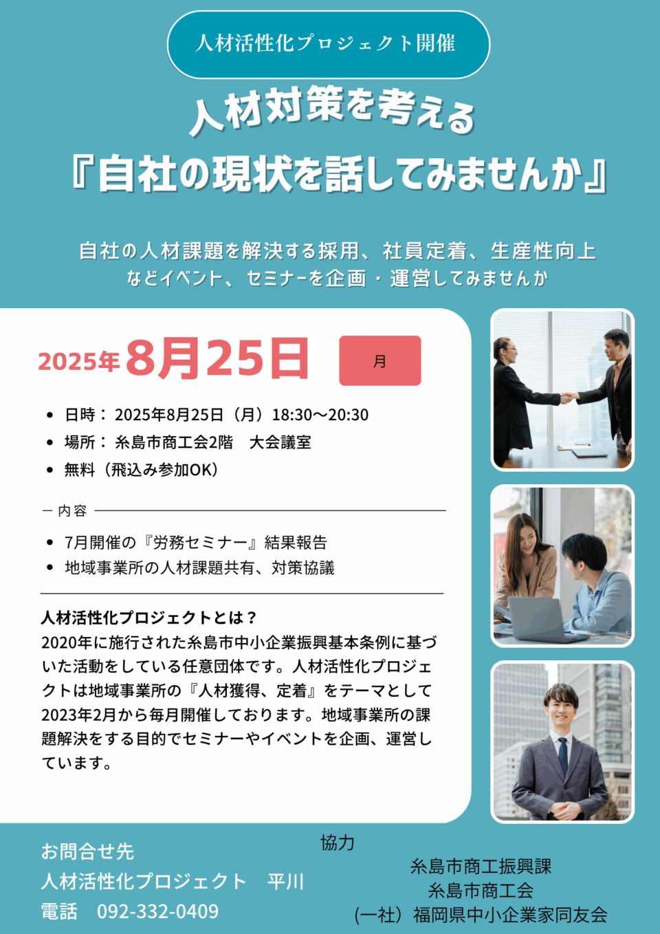 開催場所:糸島市商工会館2階 大会議室(糸島市前原北1丁目1-1) 参加無料:(飛込み参加OK)